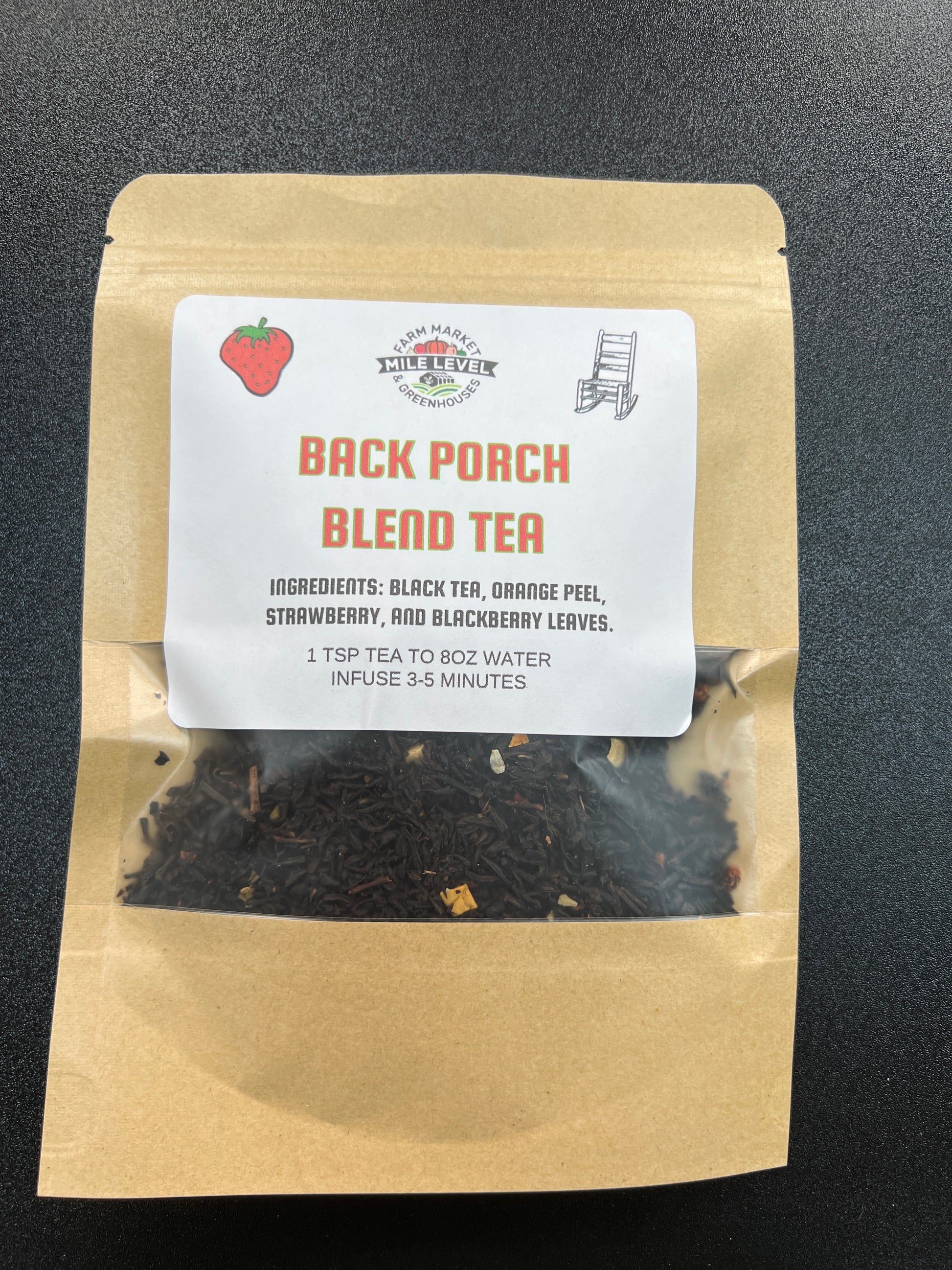Blend of black tea, orange peel, strawberry and blackberry leaves.