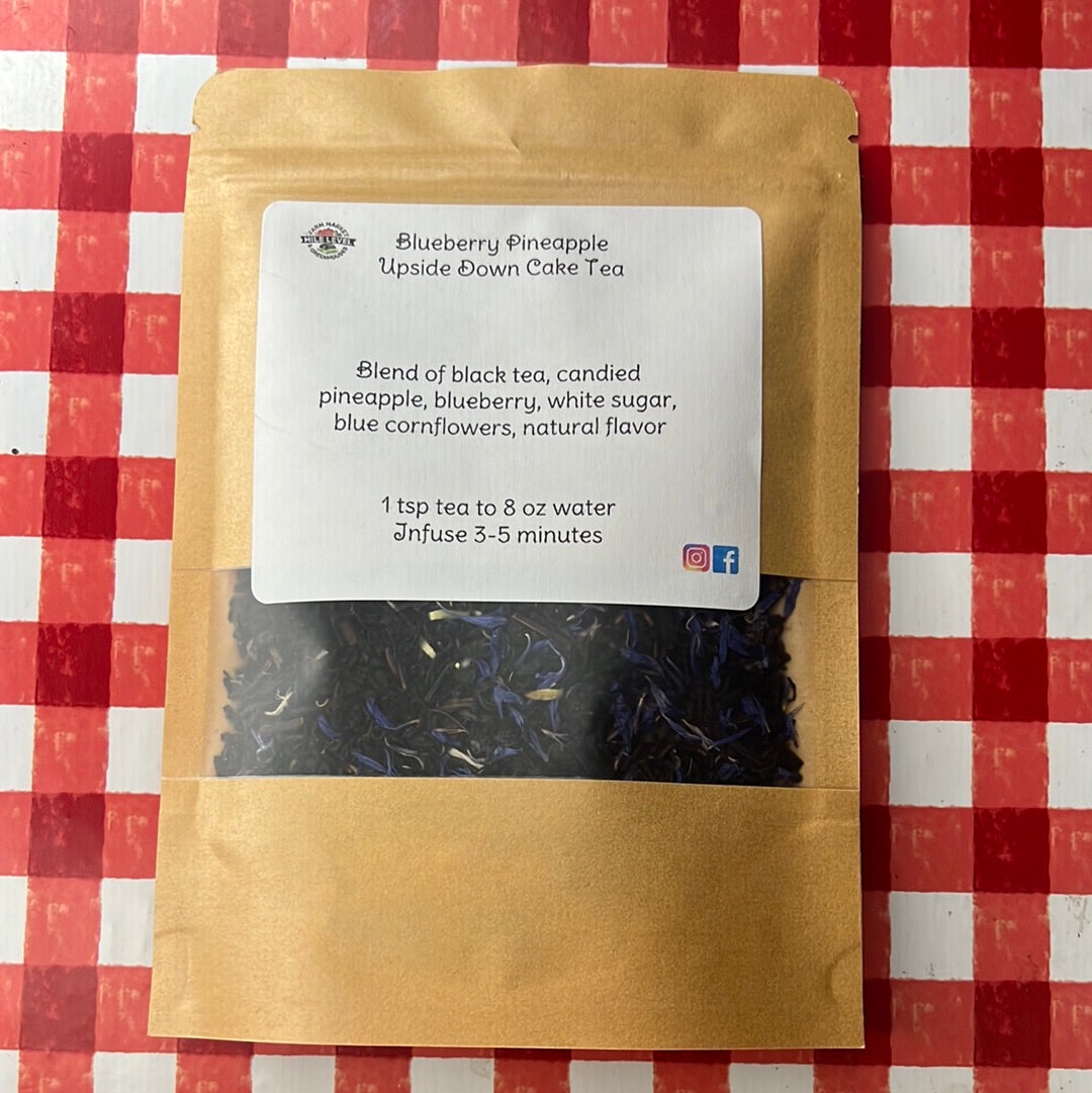Blend of black tea, candied pineapple, blueberry, white sugar, blue cornflowers, natural flavor