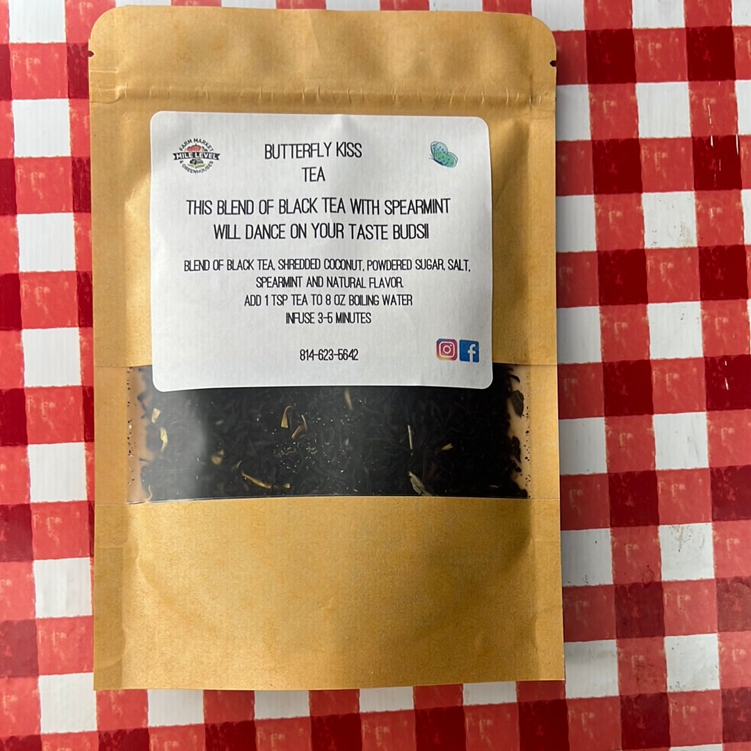 blend of black tea. shredded coconut, powdered sugar, salt, spearmint and natural flavor