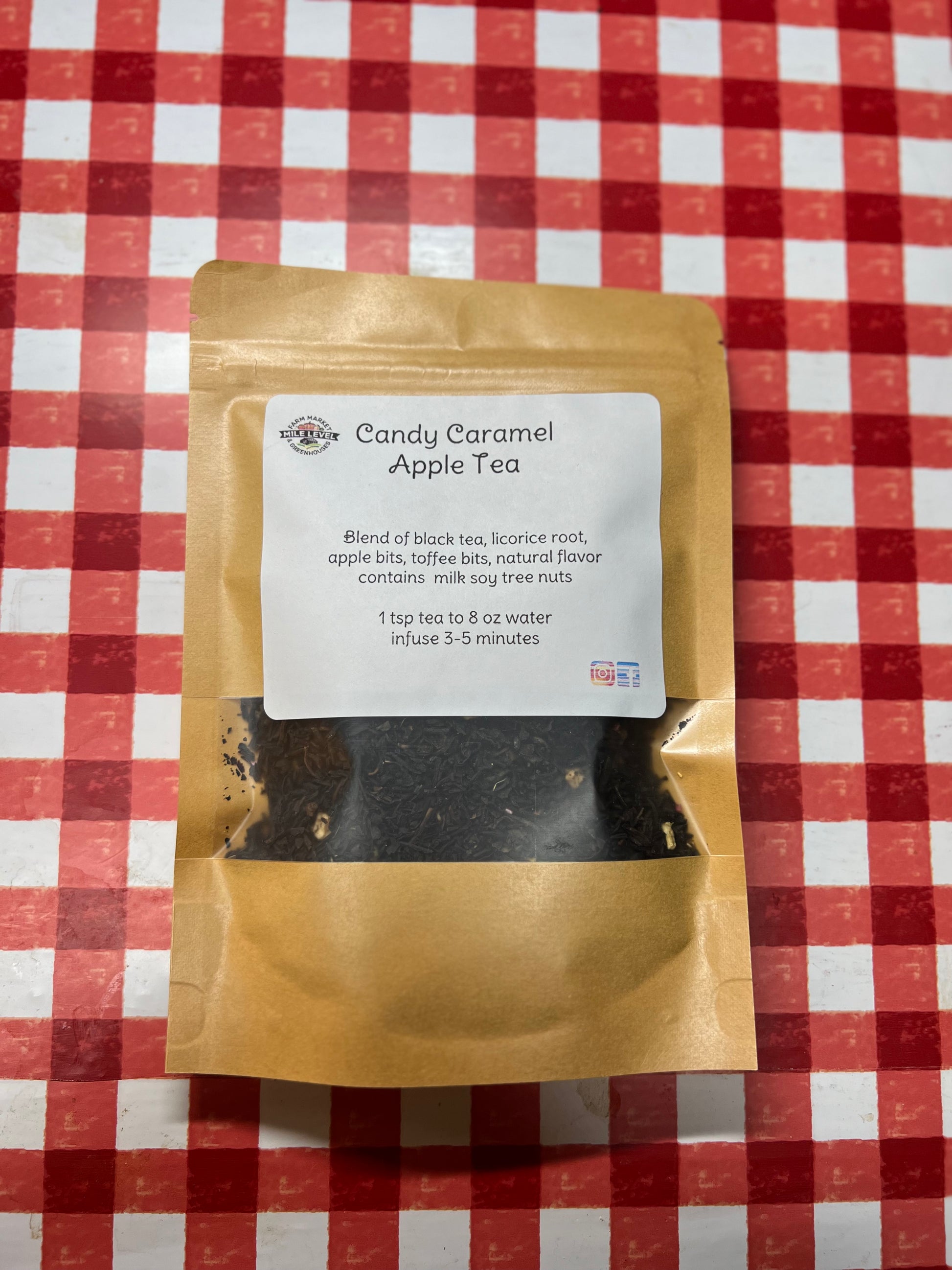 Blend of black tea, licorice root, apple bits, toffee bits, natural flavor contains milk soy tree nuts.