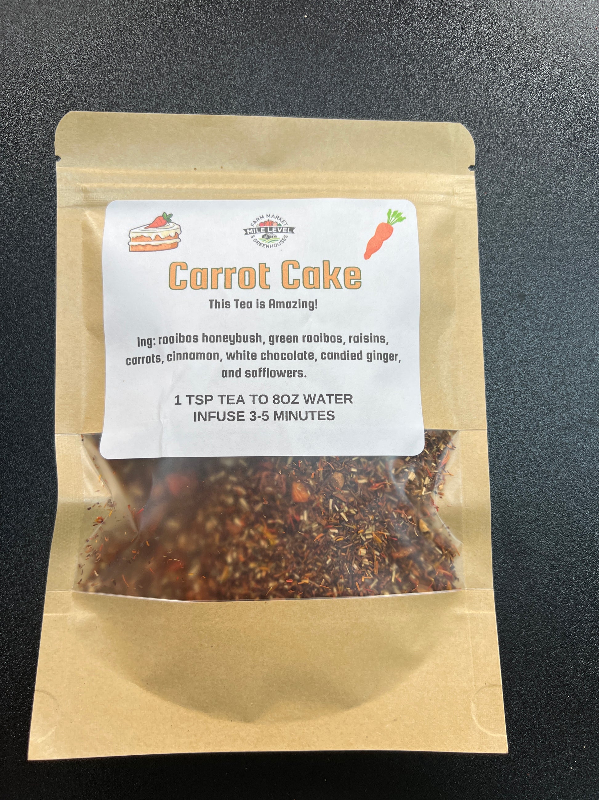 Ing: rooibos honeybush, green rooibos. raisins. carrots. cinnamon. white chocolate. candied ginger. safflowers and natural flavor