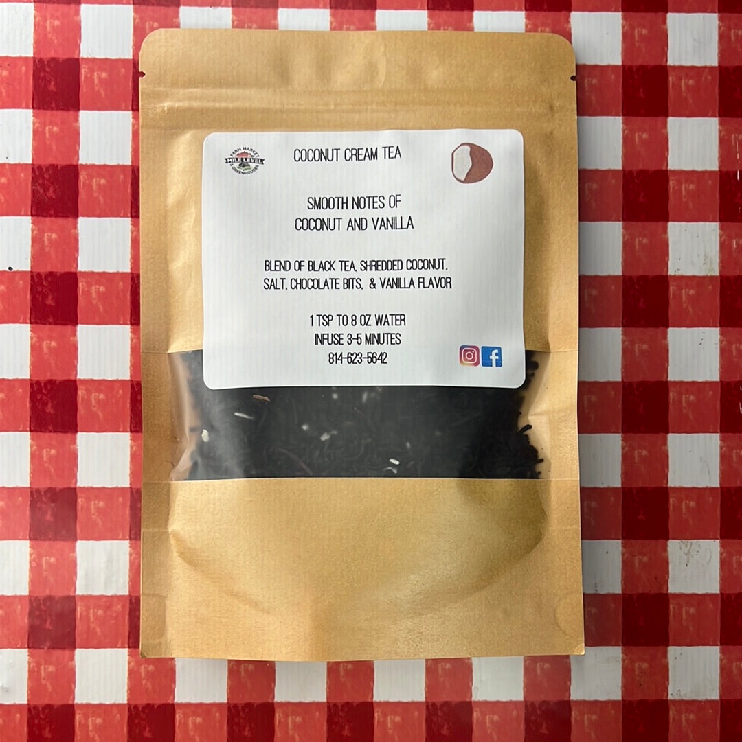blend of black tea. shredded coconut, salt. chocolate bits, and vanilla flavor