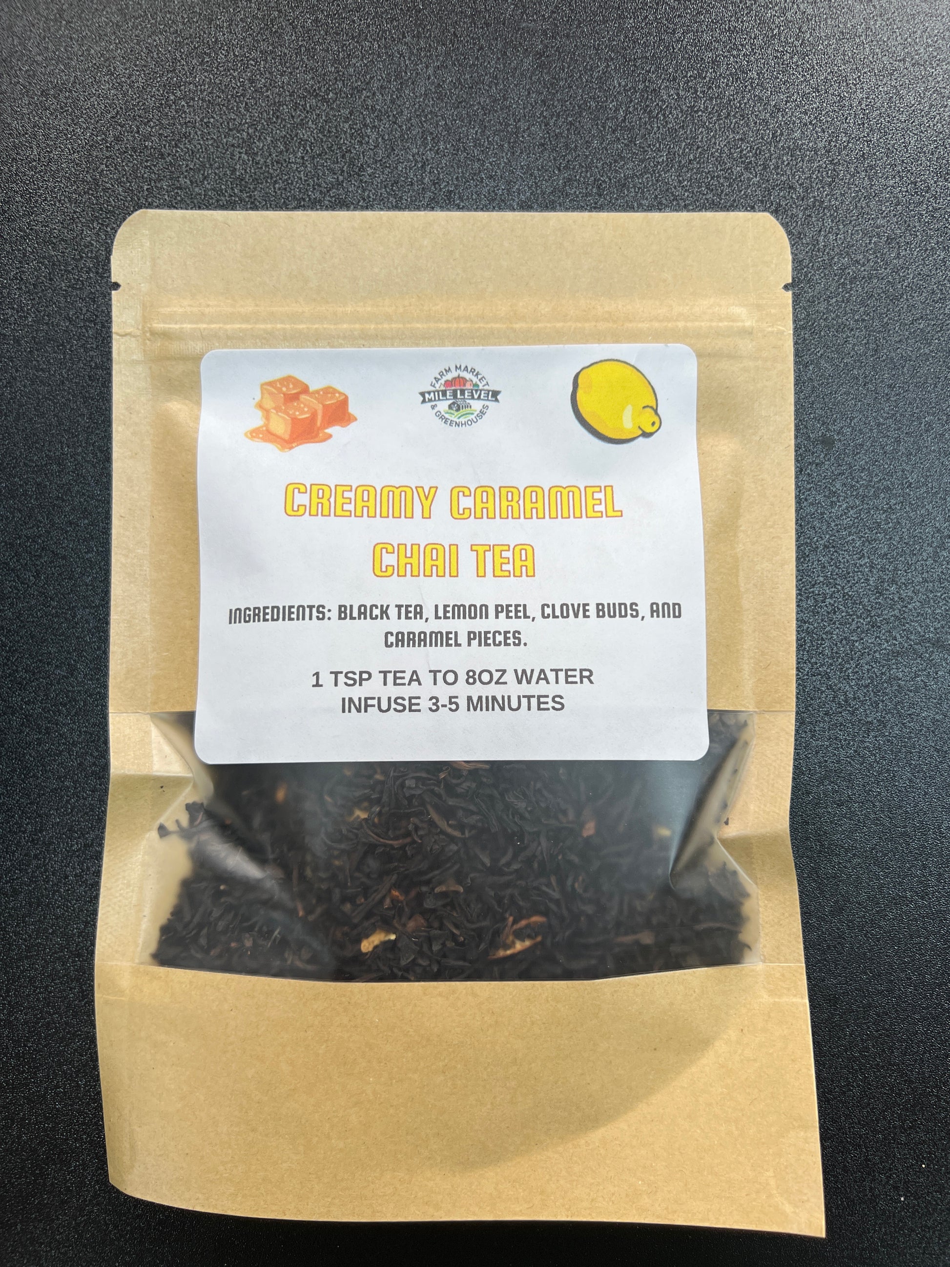Black tea, lemon peel, clove buds, and caramel pieces.