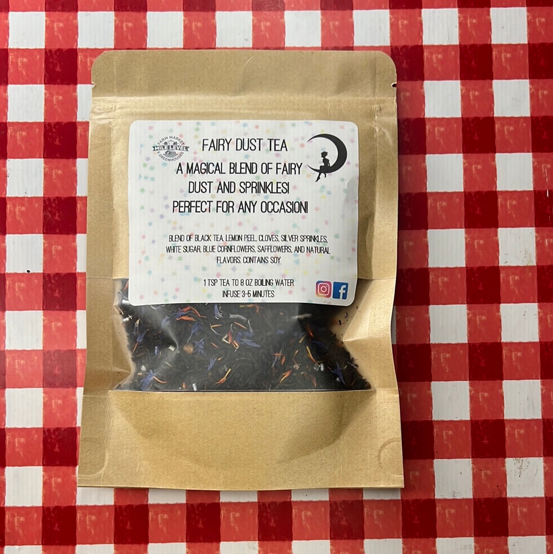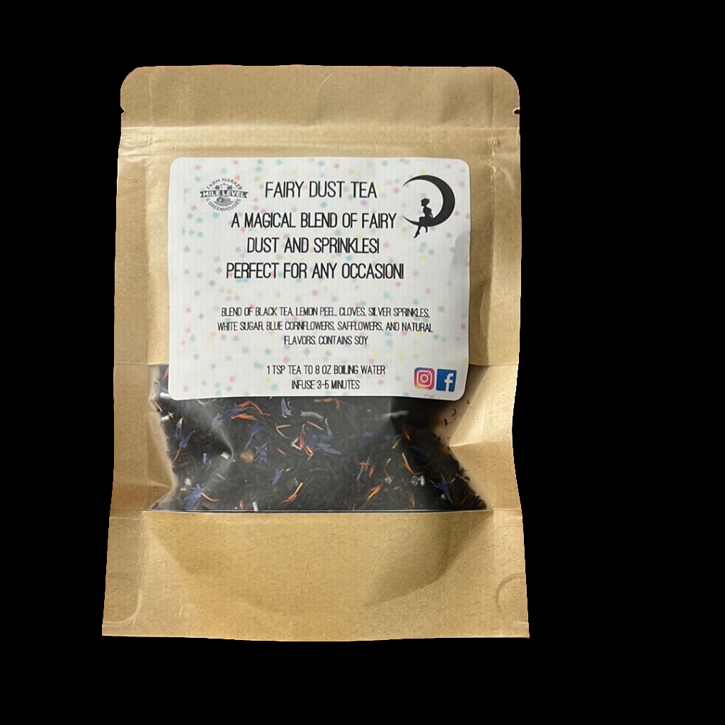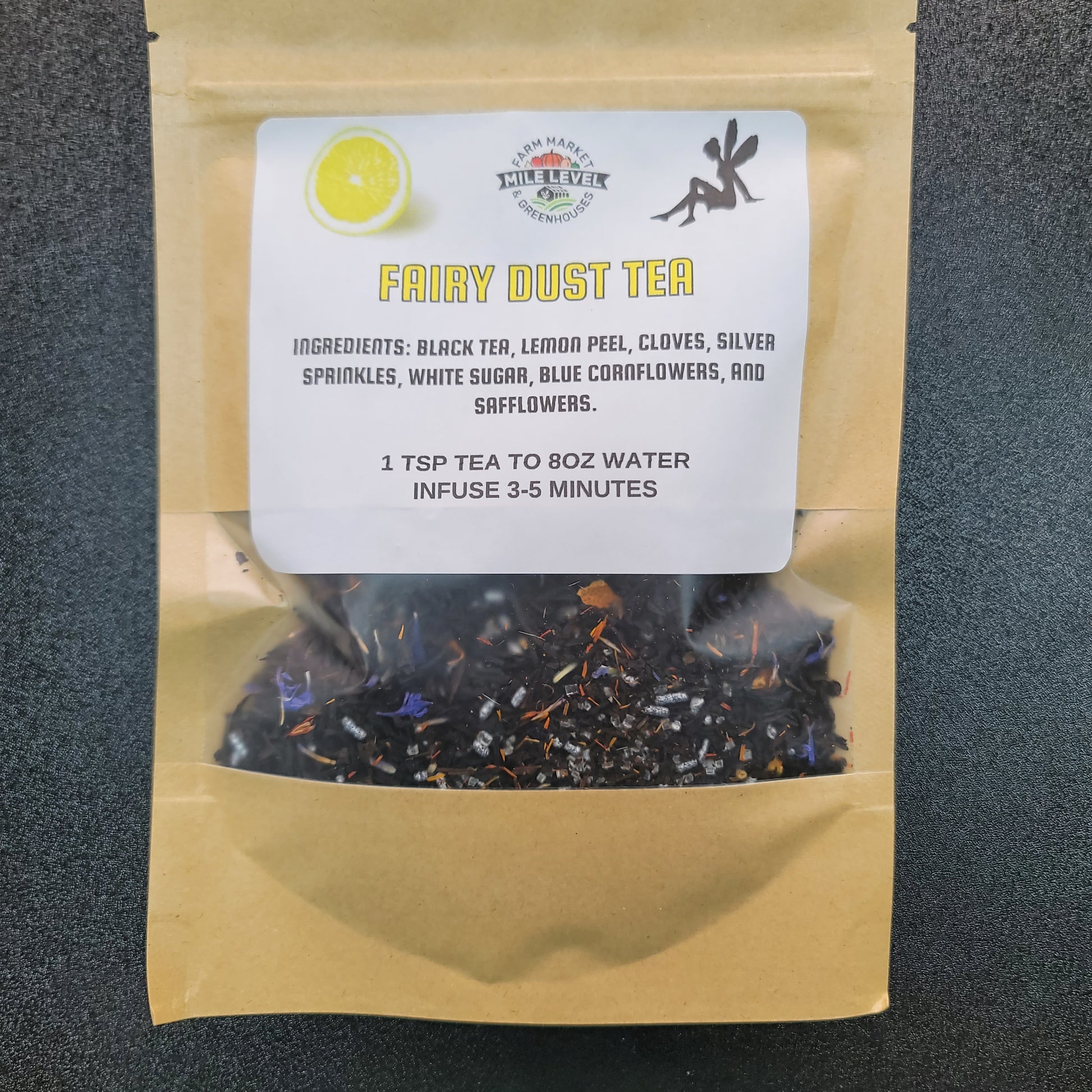 blend of black tea. lemon peel. cloves. silver sprinkles, white sugar. blue cornflowers, safflowers. and natural flavors. contains soy