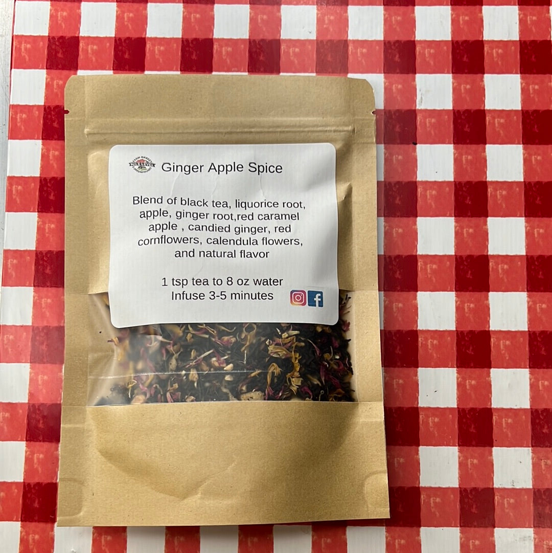 Blend of black tea, liquorice root, apple, ginger root,red caramel apple, candied ginger, red cornflowers, calendula flowers, and natural flavor