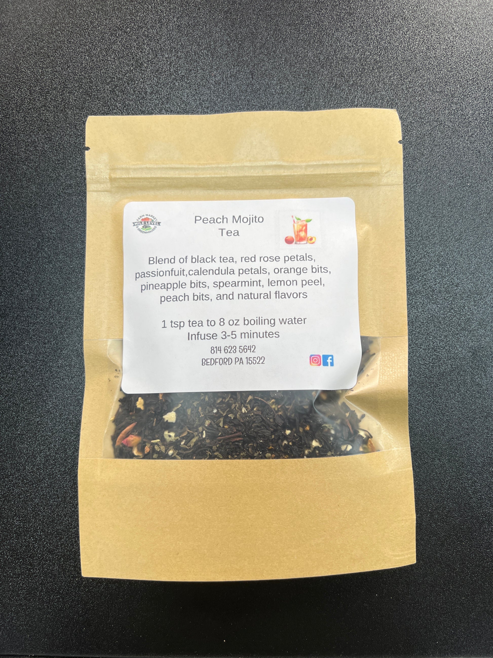 Black tea, red rose petals, passionfruit, calendula petals, orange bits, pineapple bits, spearmint, lemon peel, peach bits, and natural flavors.