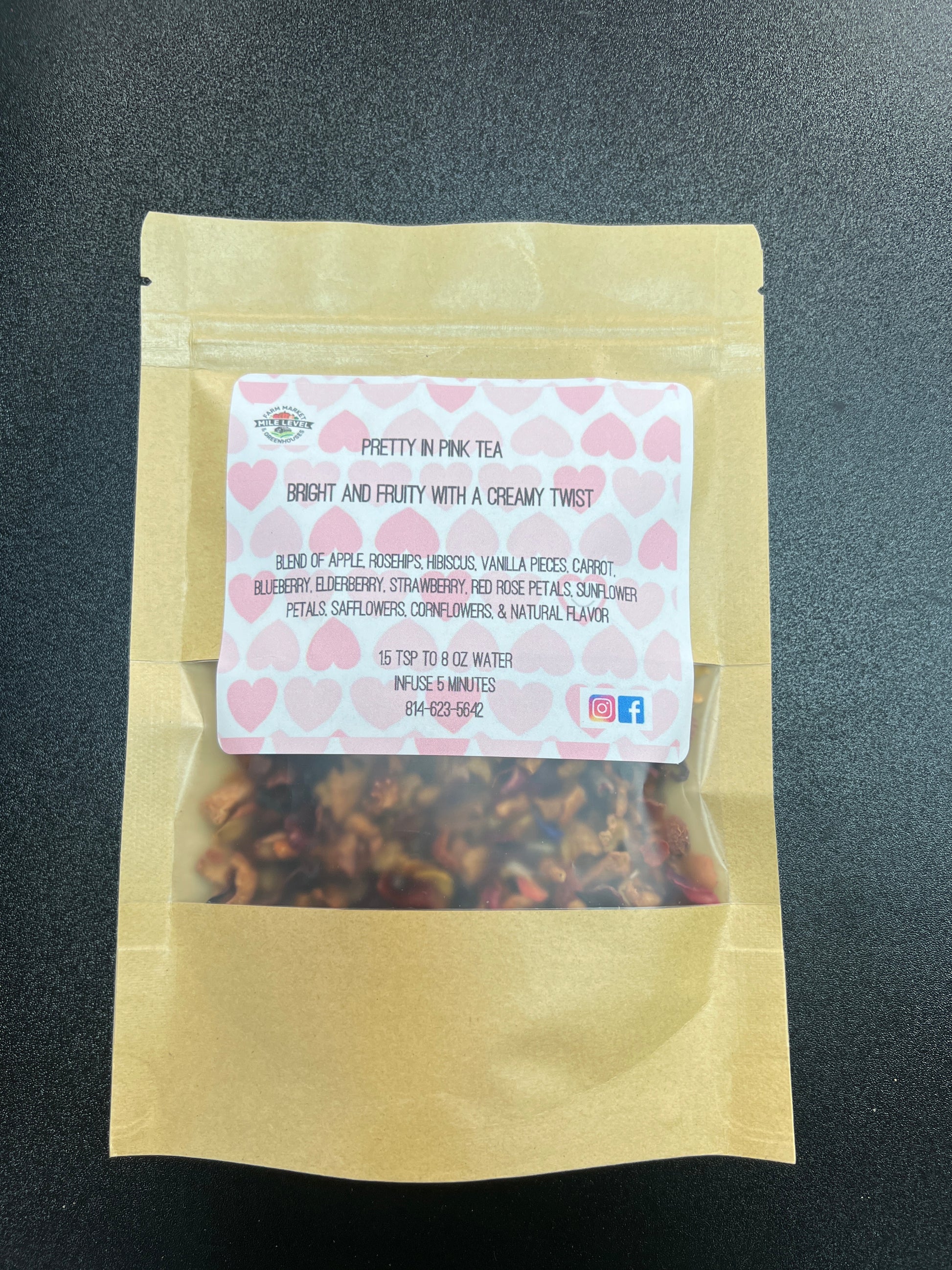 BLEND OF APPLE. ROSEHIPS, HBISCUS. VANILLA PIECES, CARROT. BLUEBERRY, ELDERBERRY. STRAWBERRY. RED ROSE PETALS, SUNFLOWER PETALS, SAFFLOWERS, CORNFLOWERS. and NATURAL FLAVOR