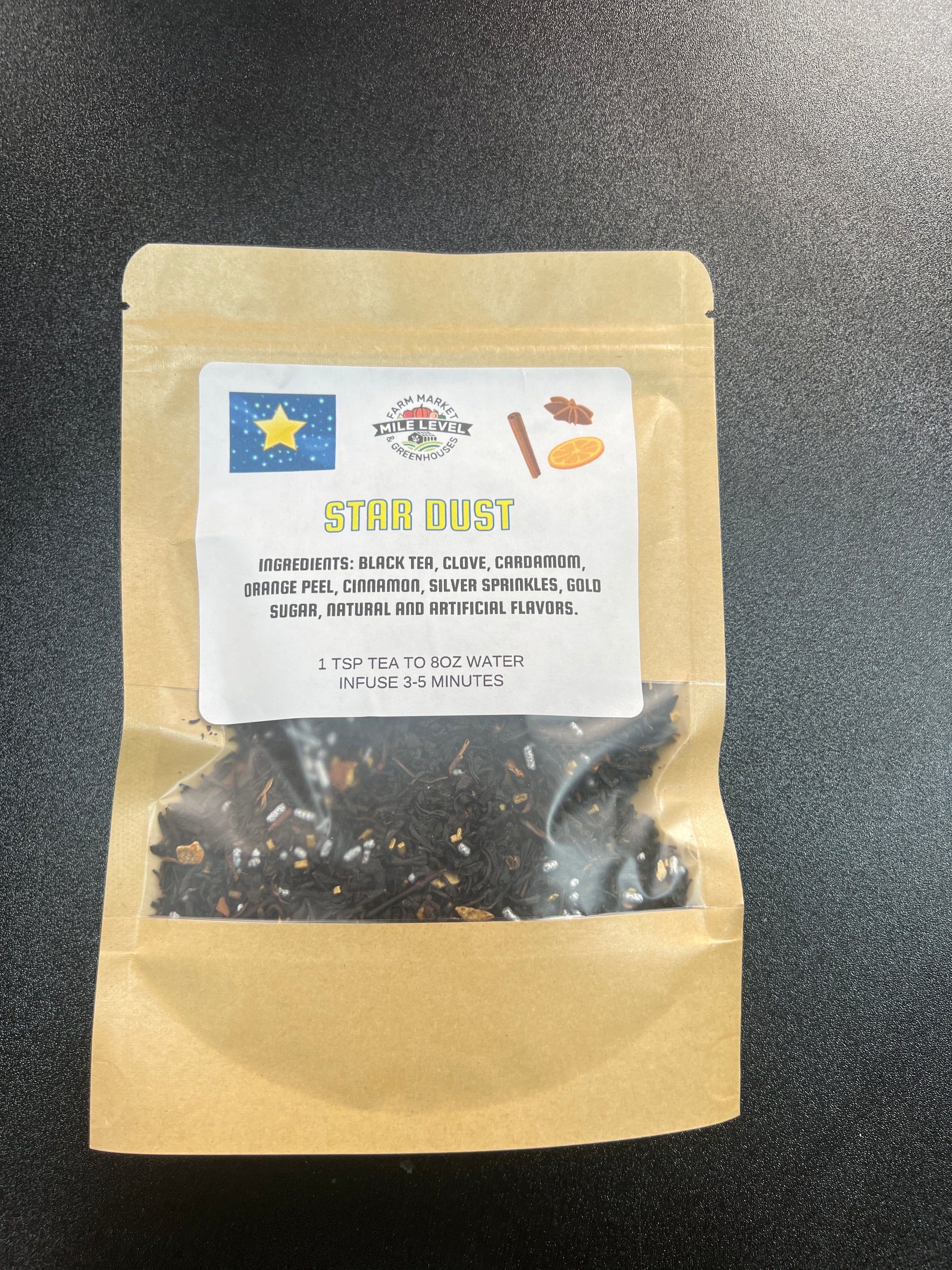 Blend of Black Tea, cardamom, orange peel, gold ball sprinkles, gold sugar, and natural flavors