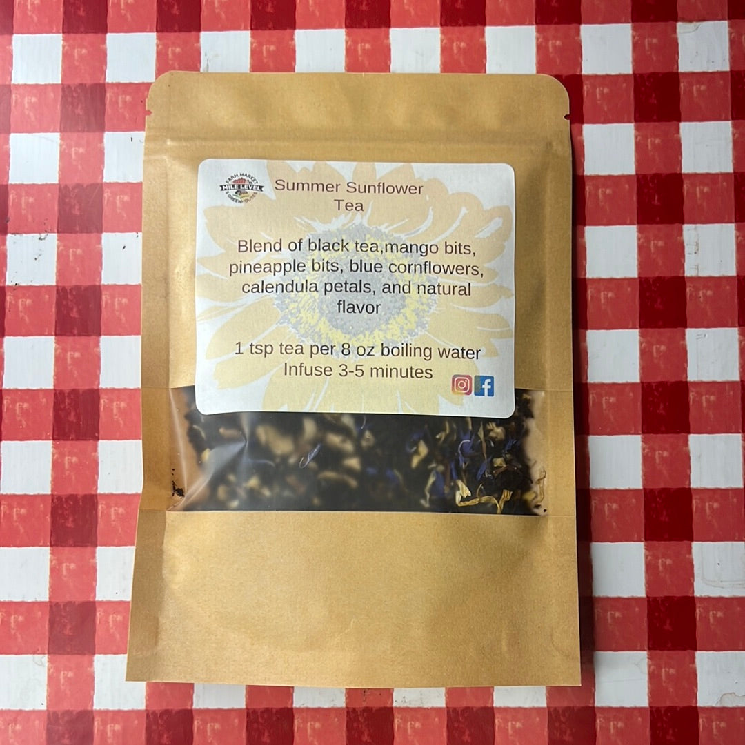 Blend of black tea,mango bits, pineapple bits, blue cornflowers, calendula petals, and natural flavor