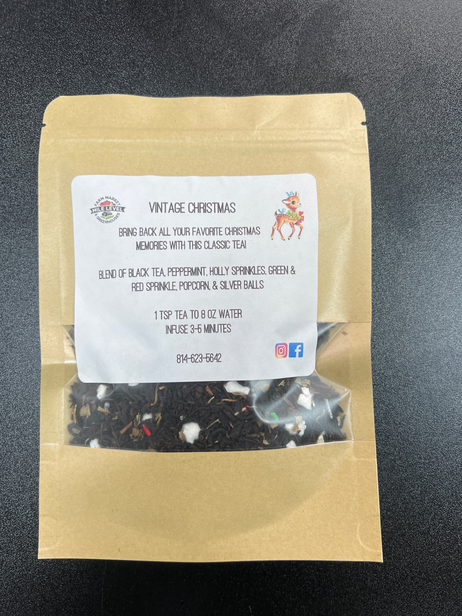 blend of black tea. peppermint. holly sprinkles. green & red sprinkle. popcorn, & silver balls