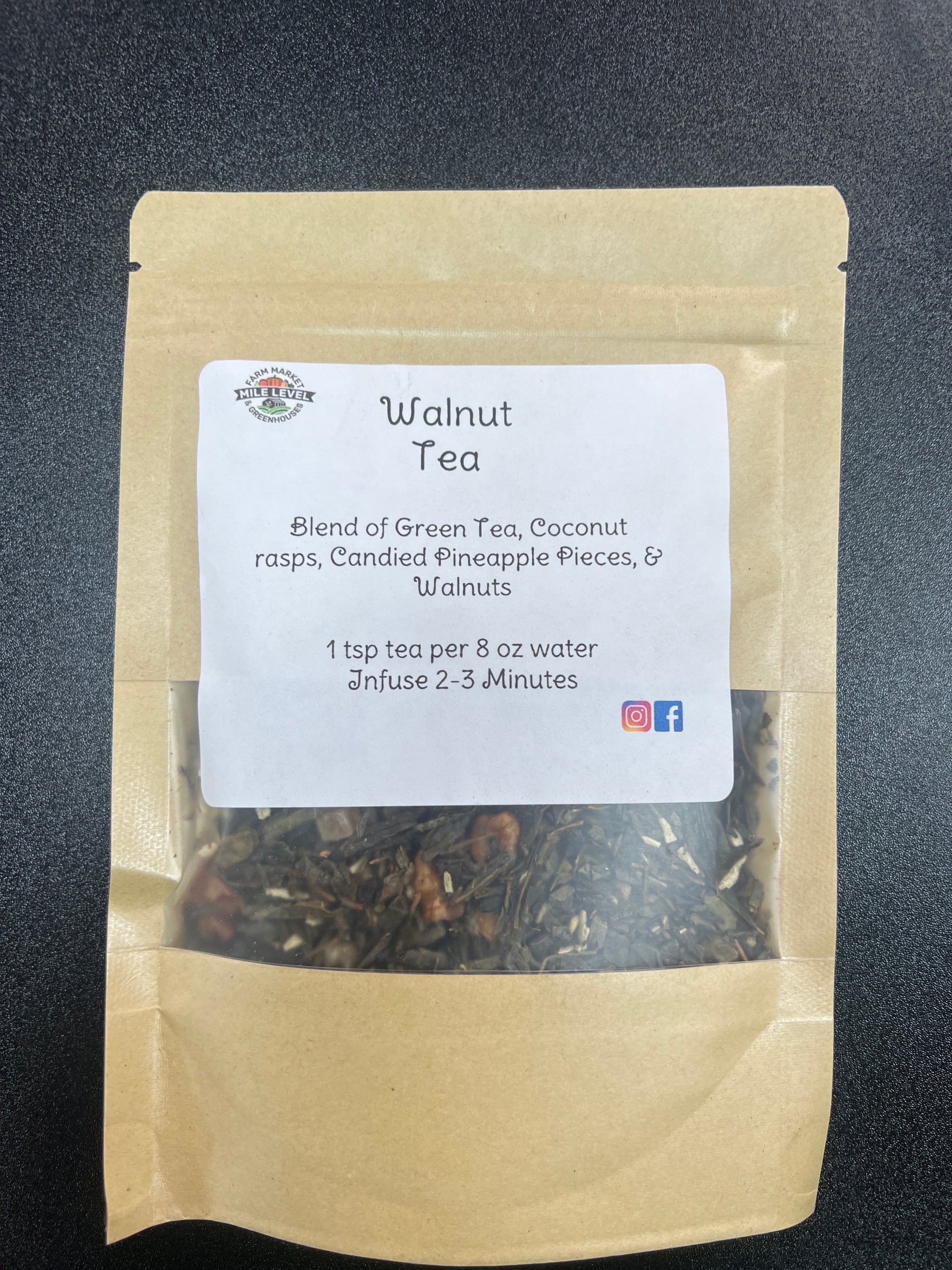Blend of Green Tea, Coconut rasps, Candied Pineapple Pieces, and Walnuts