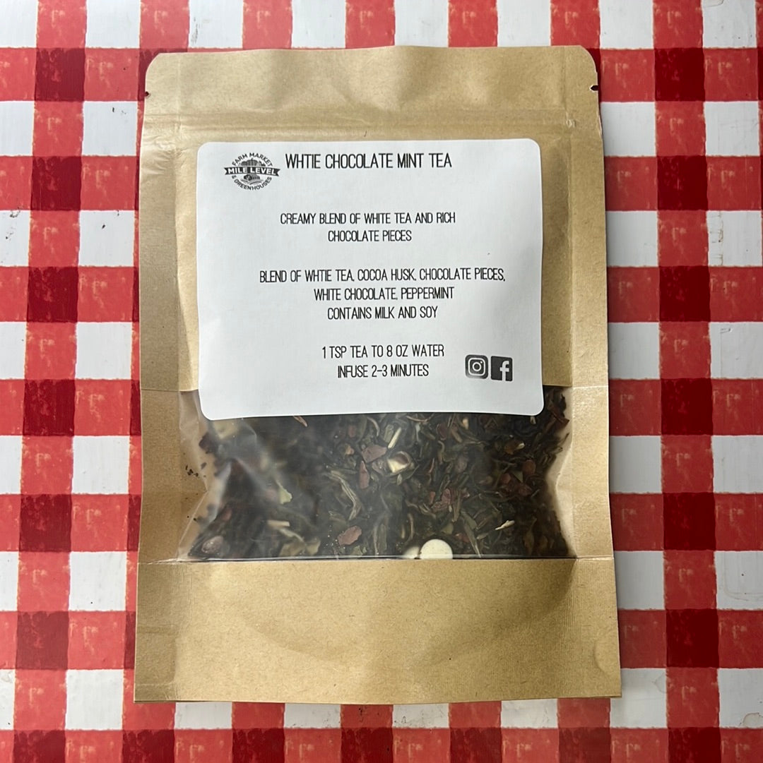 blend of white tea. cocoa husk. chocolate pieces, white chocolate, peppermint contains milk and soy